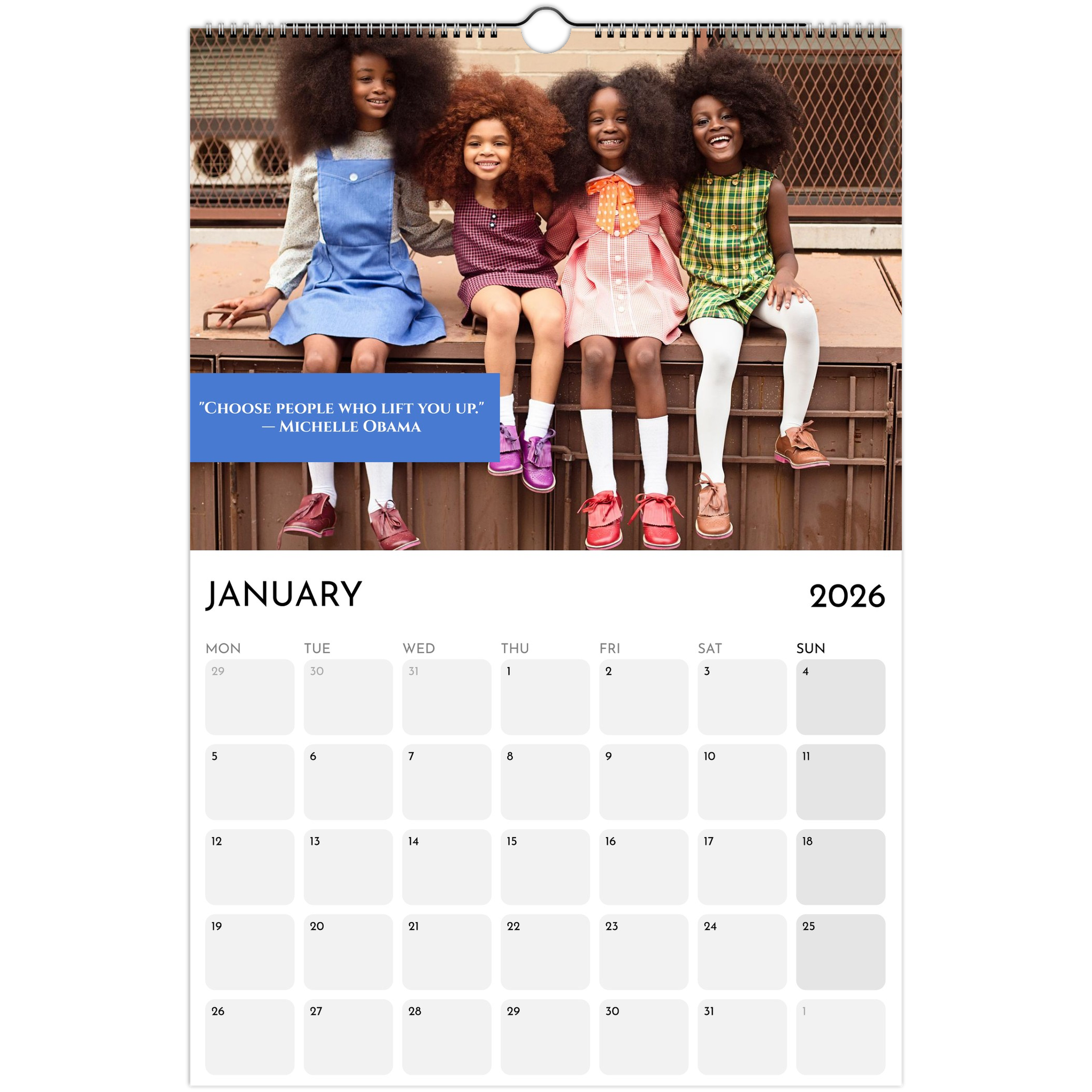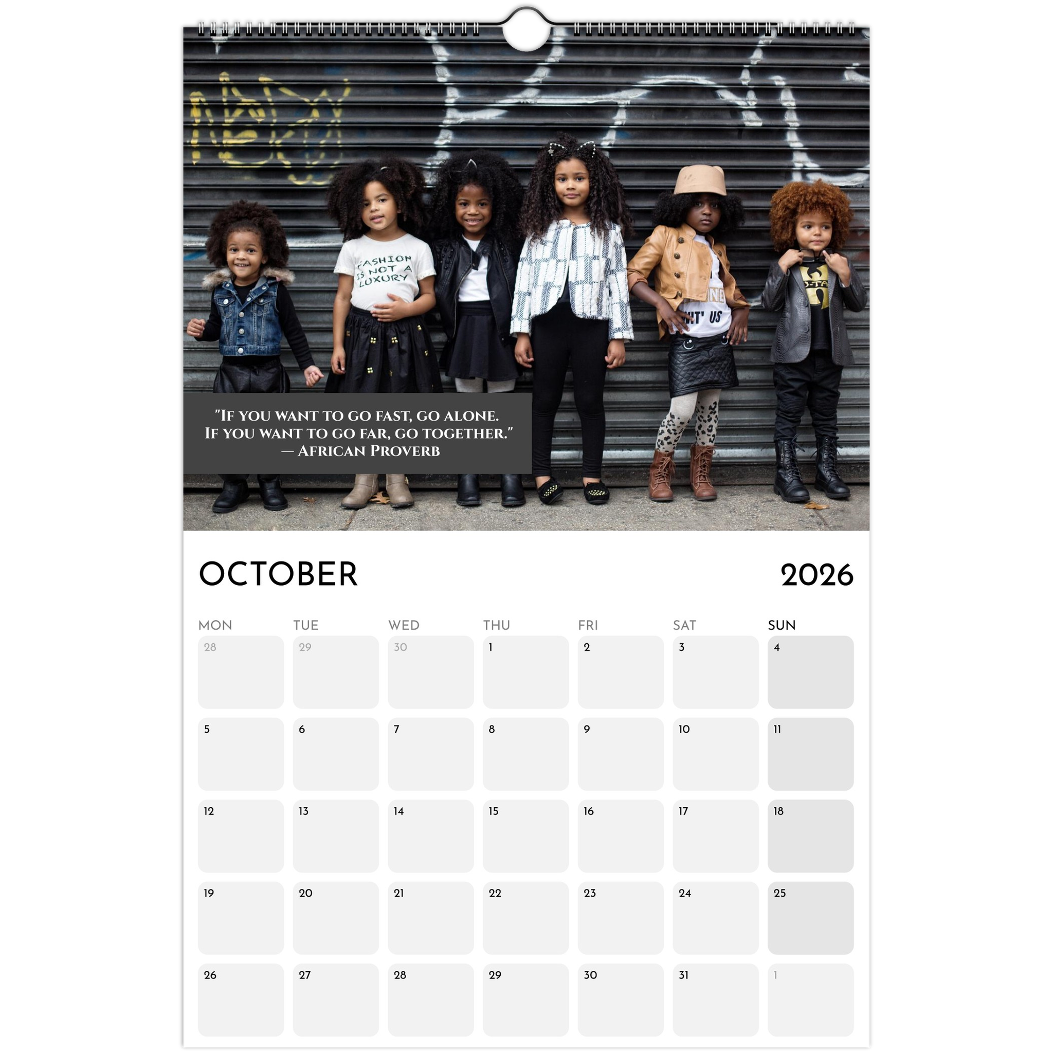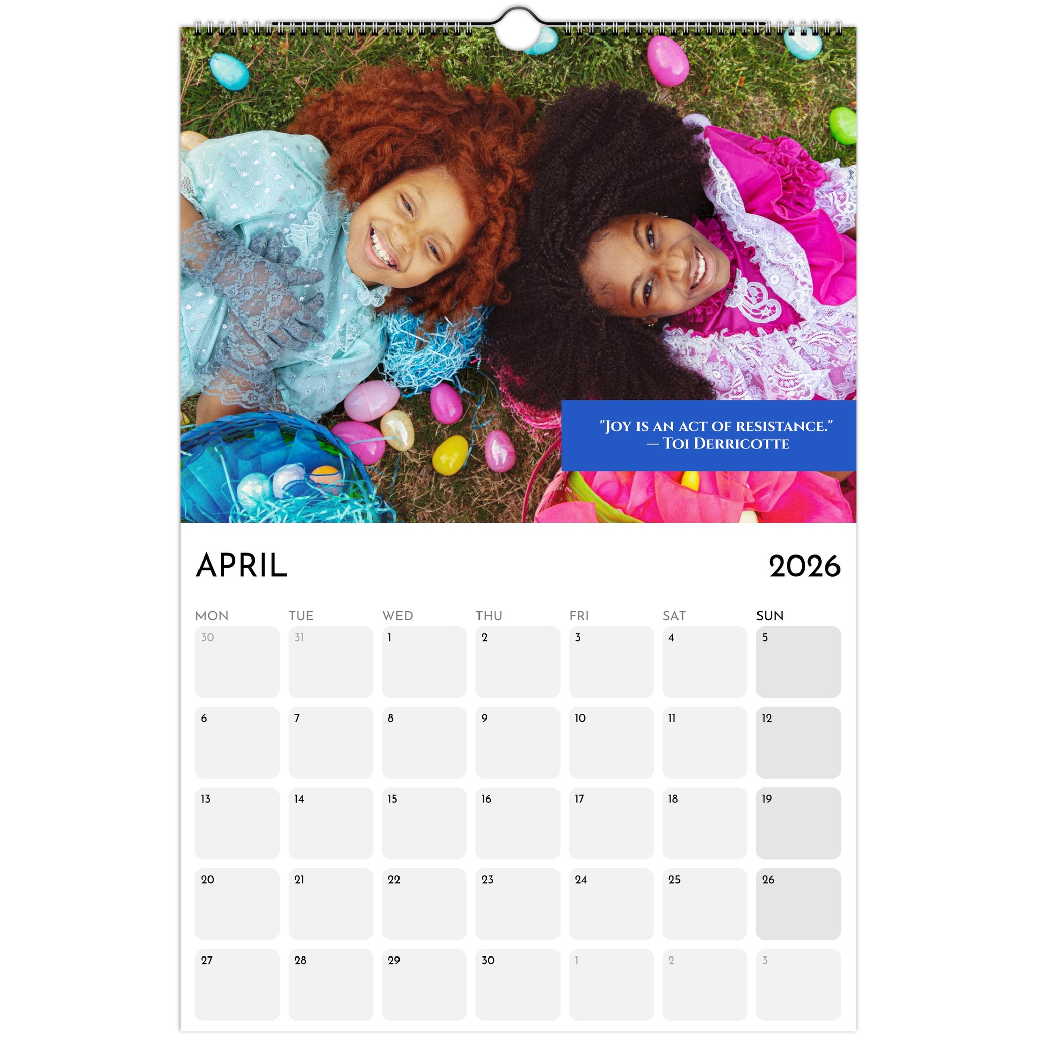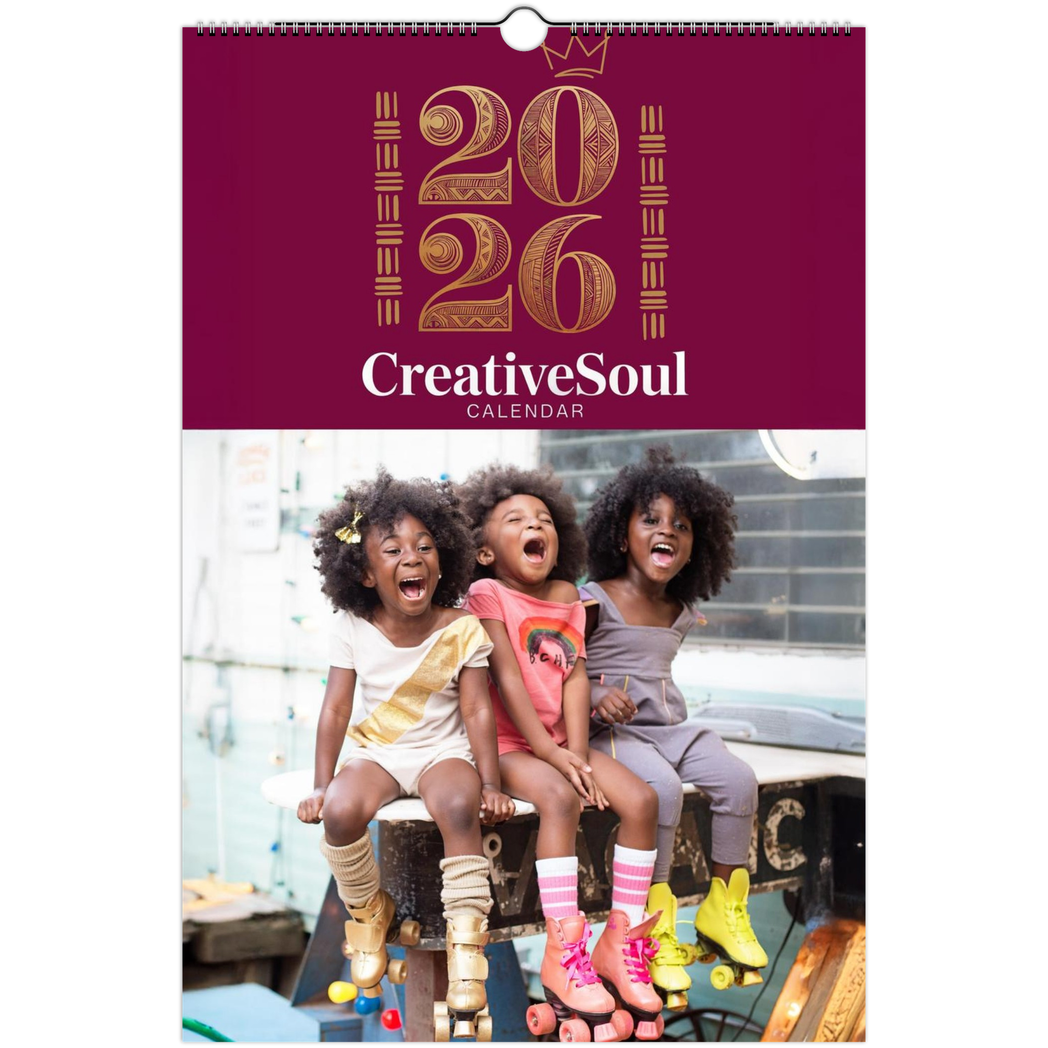 Make a bold statement with our large-format 2026 CreativeSoul Calendar. Measuring 11 x 16.5 inches, this version features one-sided prints on 14 premium pages, with a centered hole for easy hanging. Designed with a sleek black twin-loop binding and clean layout, it's perfect for showcasing stunning imagery month by month. Back sides are blank.