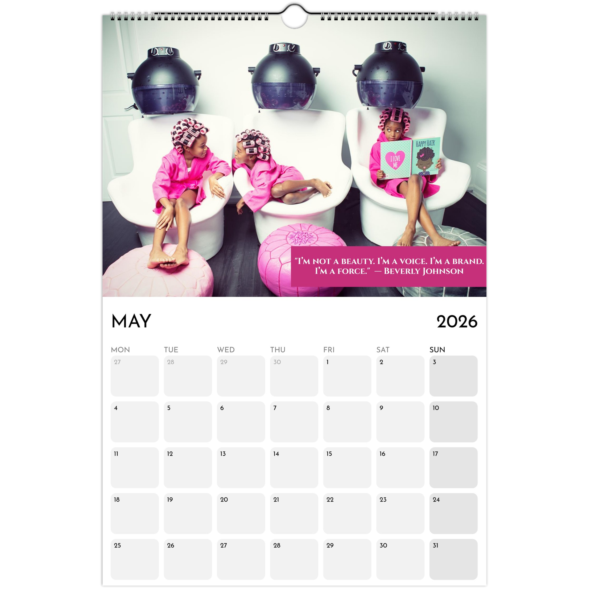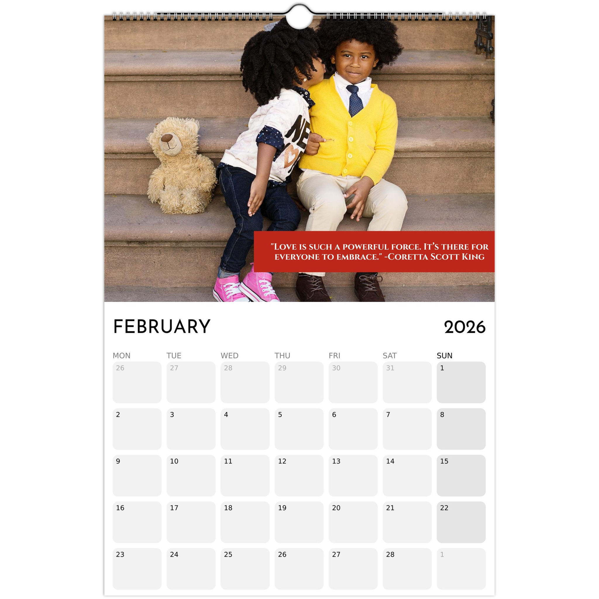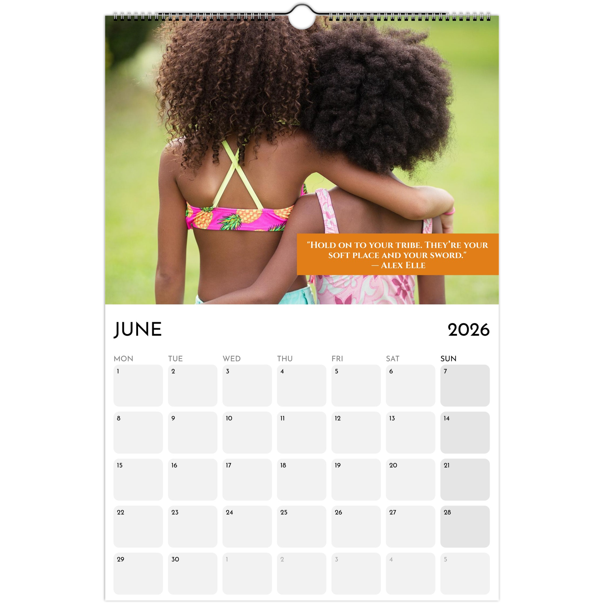 Make a bold statement with our large-format 2026 CreativeSoul Calendar. Measuring 11 x 16.5 inches, this version features one-sided prints on 14 premium pages, with a centered hole for easy hanging. Designed with a sleek black twin-loop binding and clean layout, it's perfect for showcasing stunning imagery month by month. Back sides are blank.
